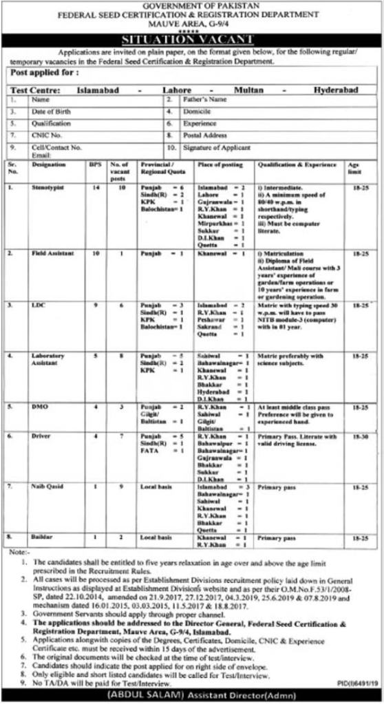 - Applications along with copies of the degrees, certificates, domicile, CNIC & experience certificates must reach the office of Director General, Federal Seed Certification and Registration Department, Mauve Area, G-9/4, Islamabad.