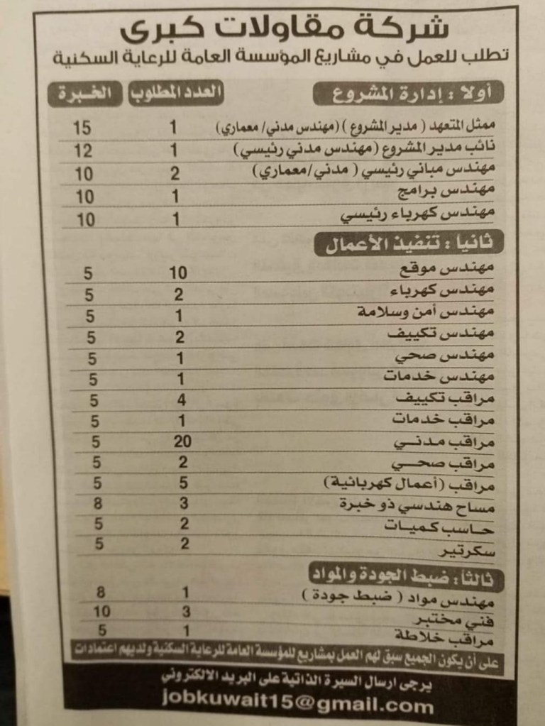 کویت میں سرکاری کنٹریکٹ بیس پروجیکٹ کے لئے فوری طور پر کچھ ملازمین کی ضرورت ہے